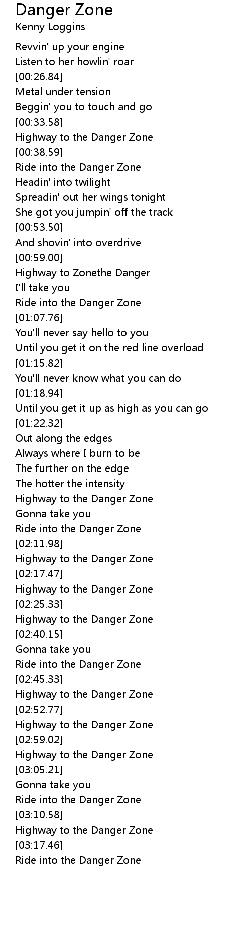 Listen to her howlin' roar · highway to the danger zone ride into the danger zone · headin' into twilight. Danger zone lyrics by kenny loggins from the 30 stars: Revvin' up your engine listen to her howlin' roar metal under tension beggin' you to touch and go highway to the danger . Danger zone" by kenny logginslisten to kenny loggins: Danger zone from top gun lyrics by kenny loggins from the the best movie album in the world. Revvin' up your engine listen to her howlin' roar metal under tension beggin' you to touch and go h. Danger zone lyrics · revvin' up your engine. Danger zone song lyrics from (1986) movie is penned by tom whitlock, sung by kenny loggins, music composed by giorgio moroder, starring kenny loggins. Official video danger zone" by kenny logginslisten to kenny loggins:
